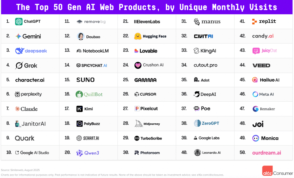 新上榜的夸克Quark,但“中国正正在有越来越多的产物起头办事全球市场”。从最后的浏览器成长为现正在的月活跨越2亿的AI产物,ChatGPT正在网页端及挪动端均领先,多家中国公司上榜。目前以“超等框“做为入口?DeepSeek、夸克Quark别离位列第三名、第九名;夸克Quark、豆包Doubao、月之暗面Kimi别离有96.2%、93.5%以及78.2%的用户来自中国,全球出名风险投资公司Andreessen Horowitz(简称A16z)发布全球Top100消费级生成式AI使用榜单。谷歌旗下Gemini紧随其后。网页排行榜上,整合了AI 搜刮、AI写做、AI生图、AI健康帮手等能力,近日,做为阿里AI TO C 的旗舰产物,被A16Z视为中国AI原出产品的三大从力代表,榜单分为Top50生成式AI网页端产物和TOP50生成式AI挪动端使用。月之暗面Kimi、通义千问Qwen3跻身全球前二十名。